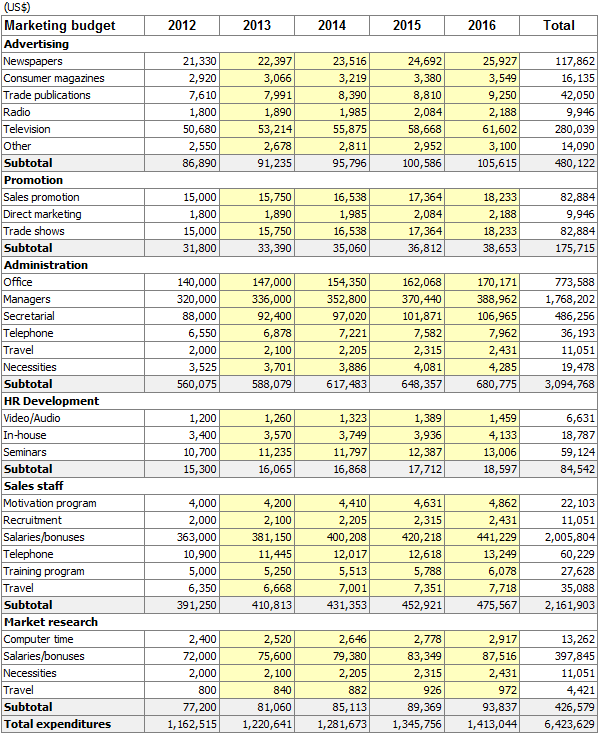 The following categories are incorporated in the marketing budget: